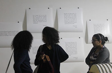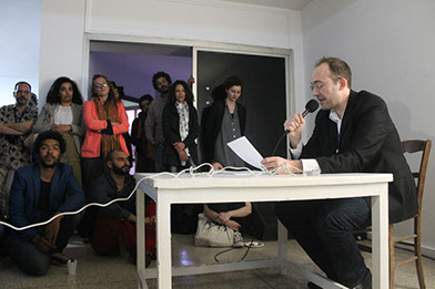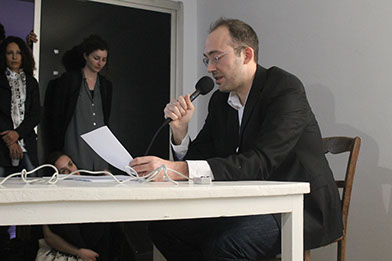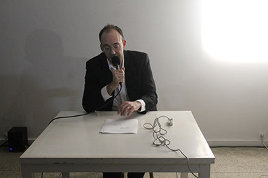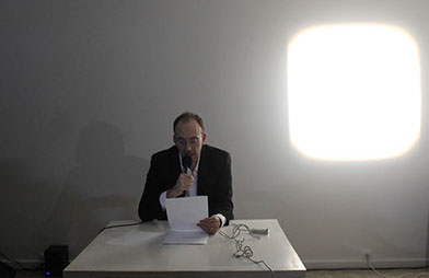 «Slide Show» est une lecture-performance spécialement créée pour MASNAÂ/CE QUI EST LÀ. Au beau milieu de «Développements», un diaporama en poésie sonore donne textuellement à voir des images publiées dans la presse (nationale, internationale, internet). Dans la lumière blanche projetée contre le mur se forment les images sortant de la bouche du performeur, peuplant l’espace virtuel de notre présent médiatique de schèmes iconographiques inédits, actifs, et ne demandant qu’à être réinvestis de nouvelles puissances discursives via la fable d’un récit. Dans l’interstice image-texte ainsi créé, une politique de la (re-)configuration de mondes possibles apparaît.