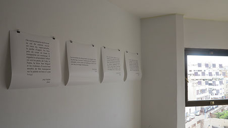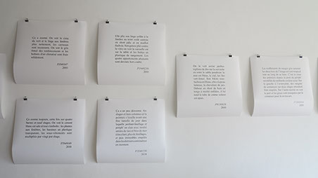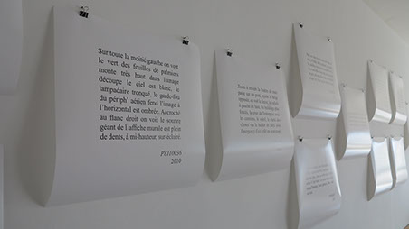 «Développements» est une exposition de textes en tirages photo numérique sur papier argentique. C’est aussi la première exposition photographique de Benjamin B., le personnage de «Departure Lounge», roman à paraître de Jérôme Game. Les images y sont produites par une caméra particulière : blocs-textes en prose, elles donnent à voir le réel globalisé via ses détours, son hors-champ ou ses décors les plus communs. Aucune mise en abîme. Du développement plutôt, entre texte et images, personnage et auteur, espace plastique et espace narratif. Et dans ce mouvement, c’est le monde comme ce qui arrive aux choses et aux êtres qui est saisi.