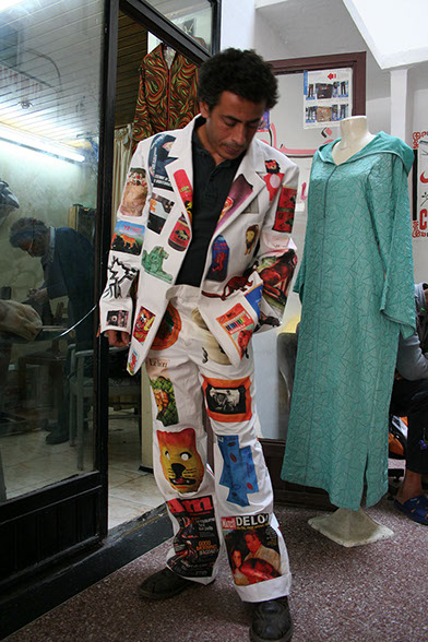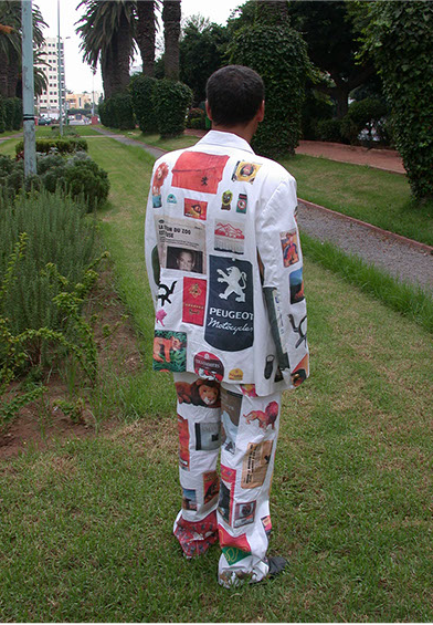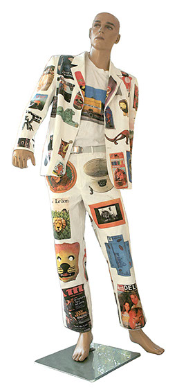 Sur les différentes parties prédécoupées du costume, aux mesures de l’artiste, les images d’une sélection d’objets de «La collection du lion» ont été imprimées par transfert. Ces éléments assemblés, le costume finalisé devient une nouvelle pièce du projet «Le lion se meurt», un mode de présentation mobile pour «La collection du lion».